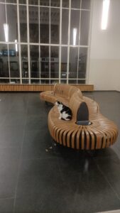 The waiting room was brightly lit, a 1950s construction with a high ceiling, no-frills, mostly bare walls, a dark tile floor and a vending machine. On a curious oblong bench in the middle sat a big black and white cat. Someone had dumped some tuna fish on the floor, but the cat was not interested. I greeted him, and he stared at me for a moment, then jumped down and sniffed my shoes and suitcase, demanded to be petted, and went back to his perch.