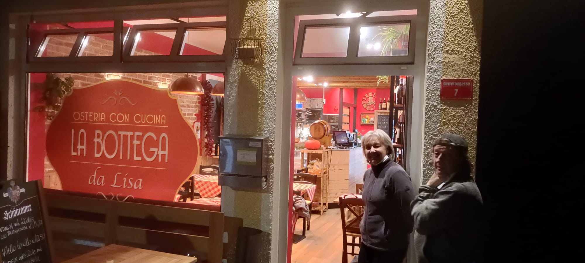 It was then that, I spotted a pizzeria with an open door.  Osteria con cucina, La Bottega da Lisa… Yellowish light spilled onto a tiny terrace. I had visions of the manger in Bethlehem. A woman was cleaning the floor. Behind the counter a man wearing a baseball cap backwards was rummaging around, cleaning, too, I guess.