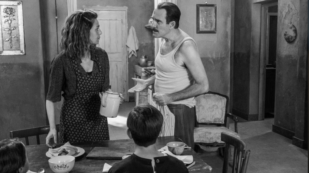 It begins with the choice of back and white film, which immediately throws us back not only to the time the film plays in (1946, Rome) but also to those despair-ridden, gritty, at times tragicomic neorealist films of postwar Italy by Vittorio de Sica (Ladri di biciclette, or Bicycle Thieves), Fellini (La Strada), Lucchino Visconti (who pre-launched the movement with Ossessione in 1943, and went on to make Terra trema).