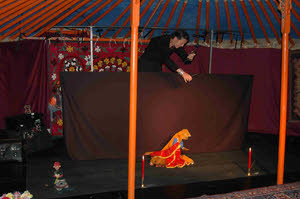 It is there, on a Sunday afternoon, that I picked up one of their shows. This one featured their kathputli puppets – a special type of string puppet originating in Rajasthan – enact vignettes from life and legend presented to the scratchy recordings of folk music taken from old 45s. The program opens with two puppet musicians playing… and very quickly you forget the intricate, perfectly timed pas-de-deux of the two puppeteers operating behind a simple anthracite backdrop. Among the more virtuosic scenes is an acrobatic horseman holding a torch on his galloping steed, a little scene featuring a woman who suddenly turns into a man, much to the disappointment of an eager suitor, and our horsemen joisting. It is a far cry from the flash-bang, often violent drama with which the entertainment industry usually tries to hypnotize spectators. But rows of children up front, some surely hardened Wii, Gameboy and TV users, are wide-eyed in fascination, so much so that they begin moving forward and at some point have to be guided back to their place.
