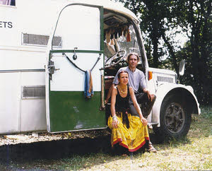 During our interview, we sat in the kitchen, essentially a wide corridor with a gas stove and an old wood cooking stove used on colder days. The walls are covered in mementoes, pictures, notes, drawings, post-its, the eclectic ephemera of a life on the road and with children. A shelf carries a crowd of strange objects, statuettes and, incongruously, an old shoe. The sheer immediacy of the outdoor takes away any feeling of being inside. It’s spring, and a host of sparrows, blue tits and blackbirds are carrying on a lively conversation. The west wind that brought a light rain is also shaking drops off the trees onto the roof above us and making the nearby highway more audible than usual. The cats come in and out of the open door. The air is rich with spices, herbal teas and espresso and a hint of patchouli, an aromatic anchor in Tina and Michel’s lives.