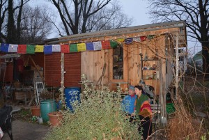 At the time of the first interview, these homes were located in a garden lot in the Cherpines area of the city, which until May of 2011 had been zoned for agriculture. The two functional homes were placed so the doors face each other. Between the two was a simple picnic table covered in wax cloth and shielded from the rain by a canvas. Often, on warm days and nights, they sit together or with any of their innumerable friends and chat, dream and discuss projects. They are as gentle with the environment as possible, always using biodegradable soaps. The waste from the toilet is compost.