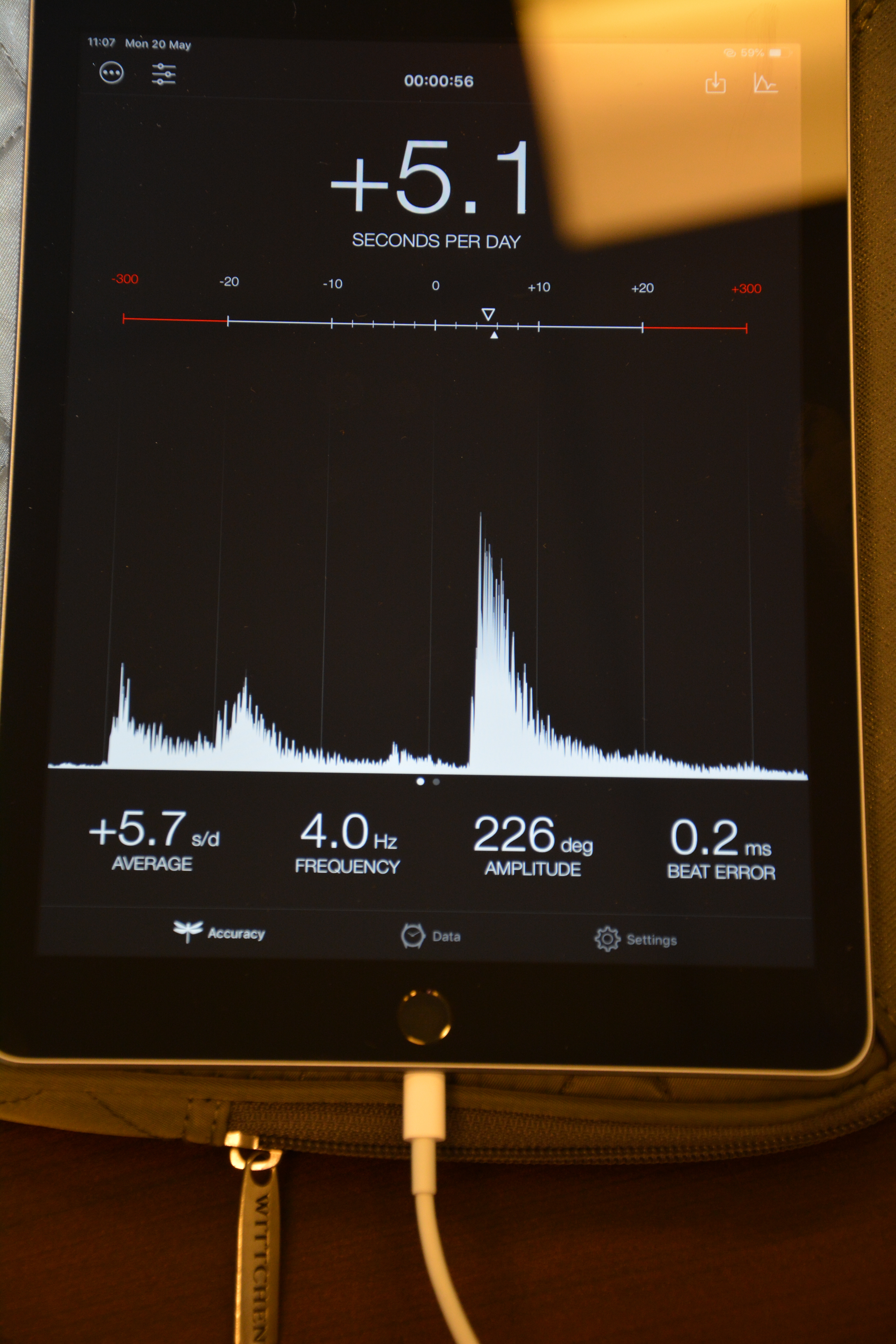 The Accuracy2 does what all testers are supposed to do. It will show the three peaks of the ticktock, and determine the beat, which is the difference between the tick and the tock: A value of 0ms is outstanding, a value of 7 or 8 ms means there’s something wrong with the escapement and it probably needs adjusting. The rate of the watch is automatically determined, and the lift is estimated, whereby most watchmakers will prefer using amplitude, according to Rousset.
