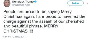 President Trump of late has been making a great deal of hay out of this fake war, tweeting, notoriously this on Christmas Eve:
